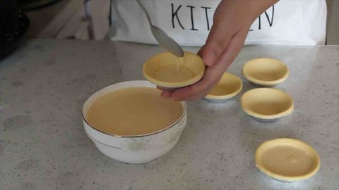 - Scoop the filtered egg tart liquid directly into the egg tart crust, and each is about 70% full.