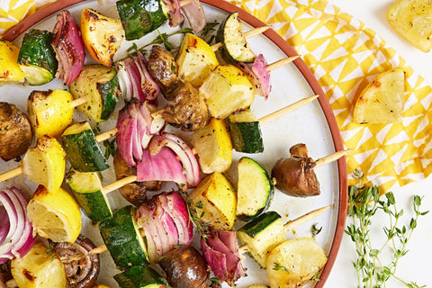 If using wooden skewers, soak them in water for 30 minutes. Put the zucchini, mushroom, onion, and lemon slices on each kebab and use them alternately.