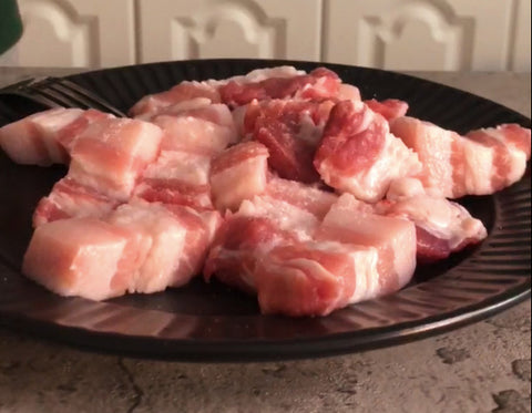 Cut the bacon and put them in a bowl, sprinkle the right amount of salt, black pepper, and cumin powder, and stir well.