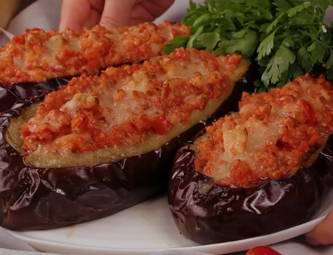 step6Take out the cooked eggplant, use a knife and fork to strip the flesh of the eggplant, add the tomato mixture to the opening, brush the surface with a layer of olive oil and sprinkle 30 grams of Parmesan.