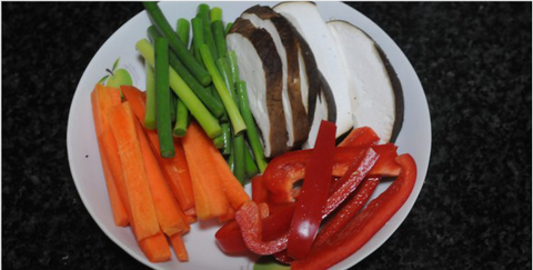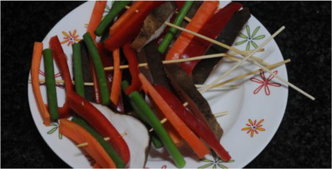 After the ingredients are cleaned, cut all into thick strips of the same length.String the vegetable strips in order with bamboo sticks