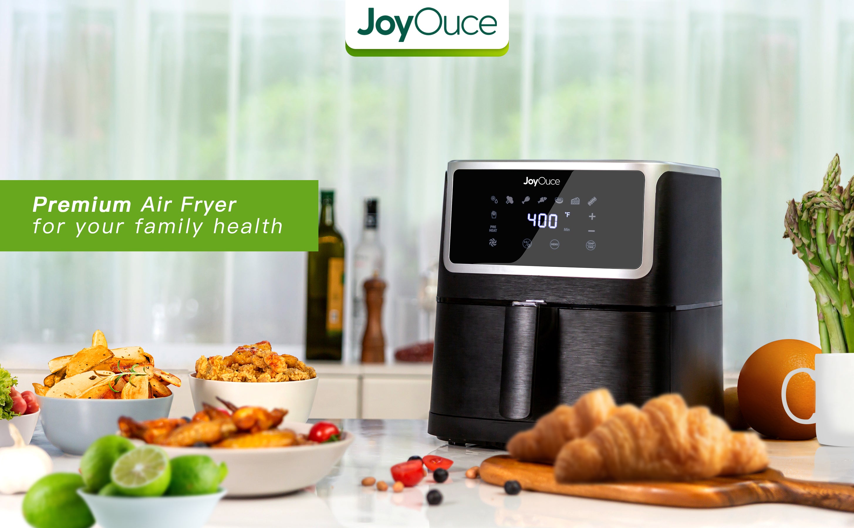 Joy 3 Air fryer is a classic European design, with an elegant brushed matte finish. JoyOuce pursues perfection in production design, including functions, structures, electric performances, details, and material selections, which makes it a perfect crafts. 5.8 quart family size air fryer provide powerful hot air, no need oil, to fry your favorite food more quick and more easy, to let your family enjoy less fat, crisp flavour and healthy food.
