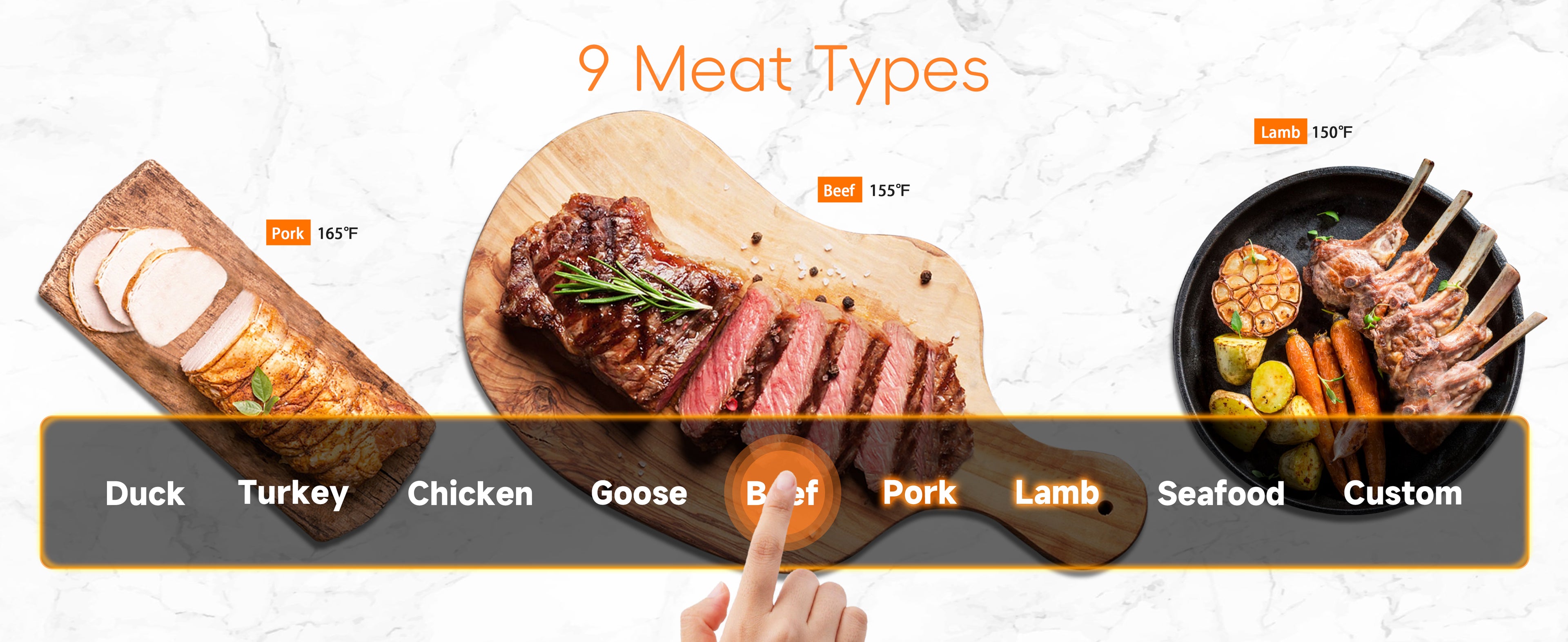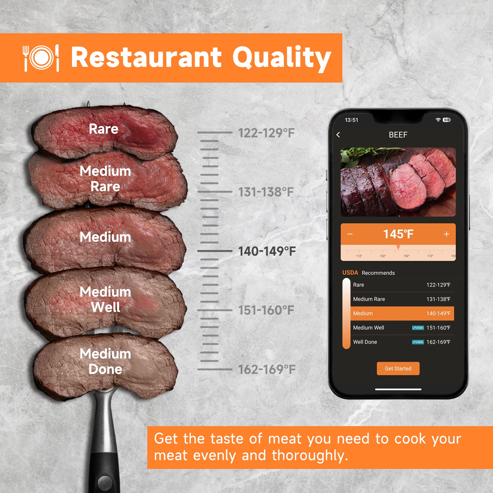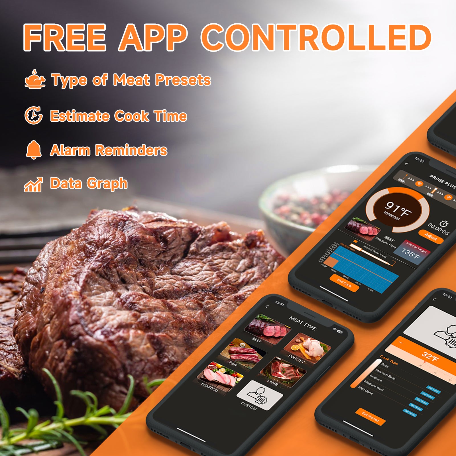 - Get Perfect Cooking with Simple Setup: Preset target temperatures, monitor cooking time, receive alerts on smart device, and track temperature fluctuations with easy-to-read charts. Includes 8 preset meat types and customizable options.