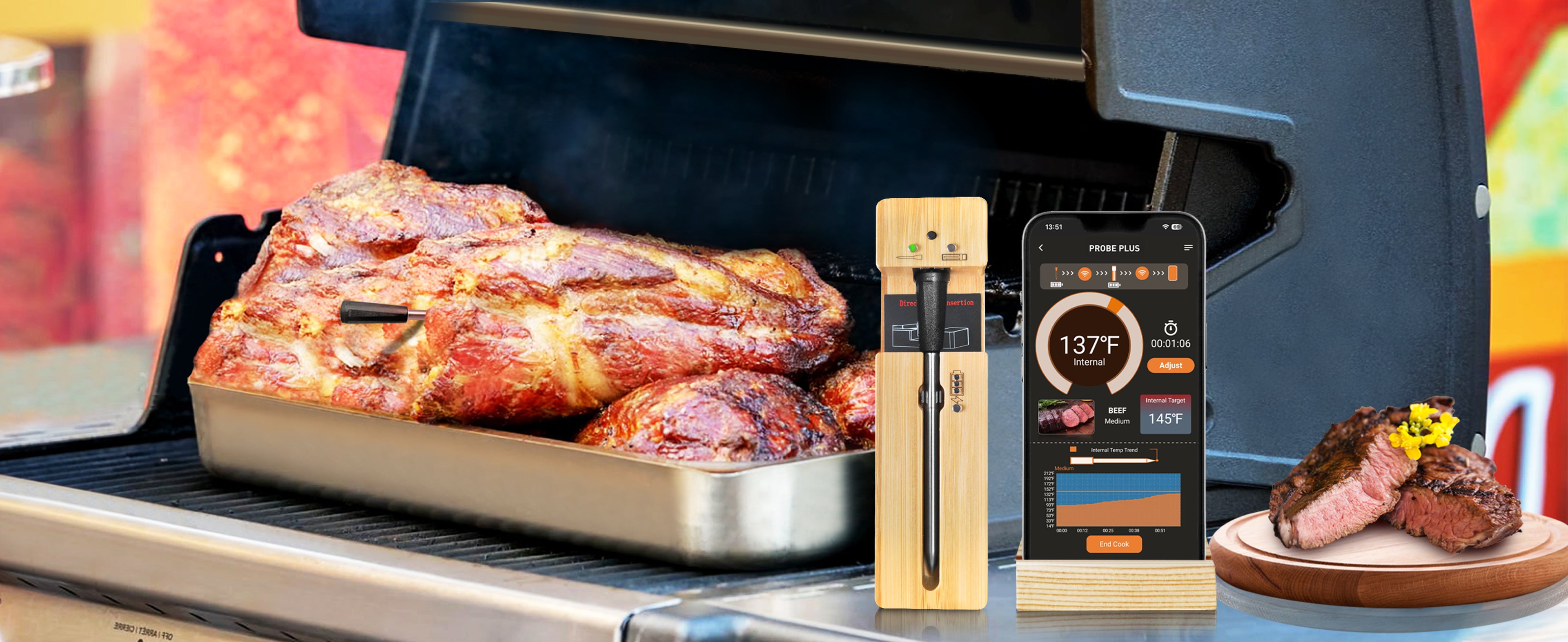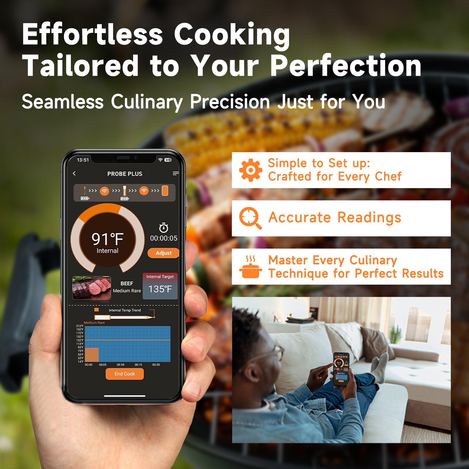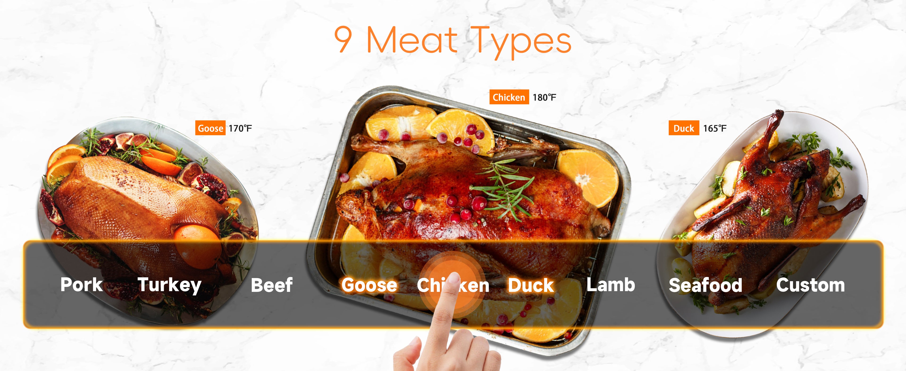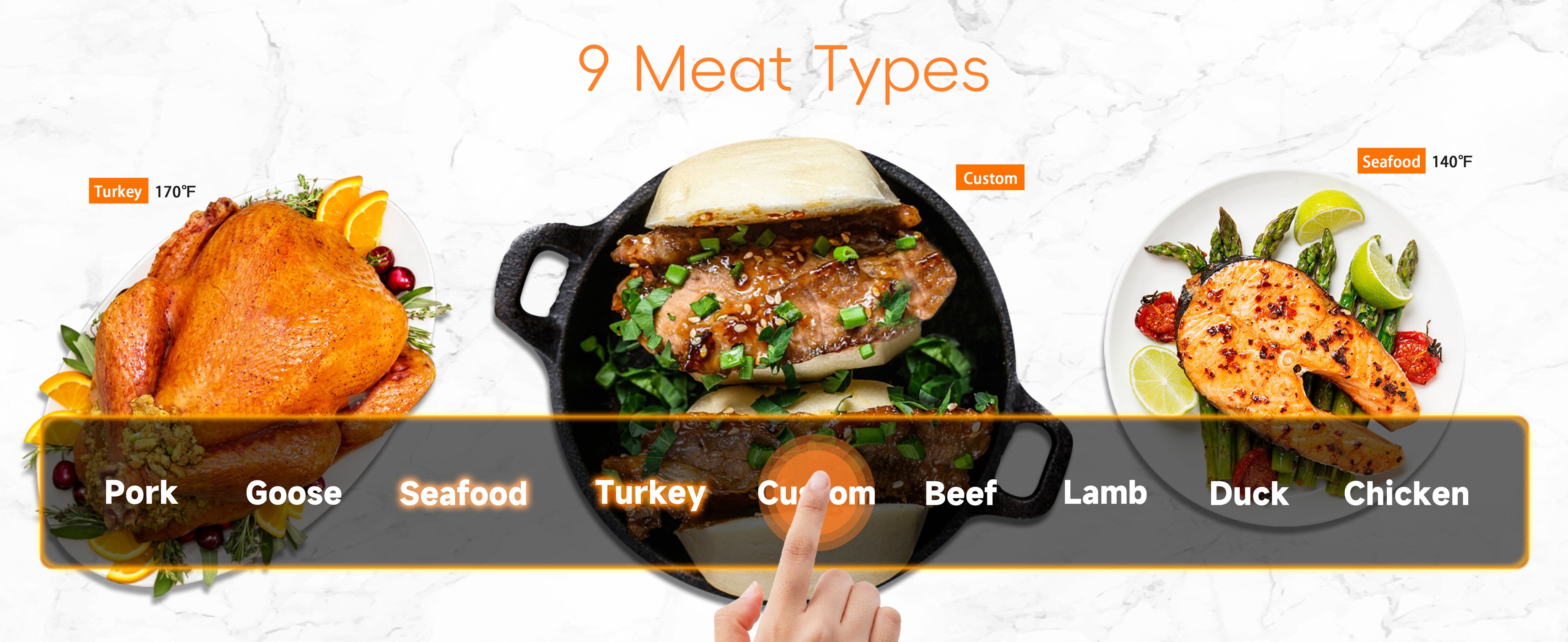 - Get Perfect Cooking with Simple Setup: Preset target temperatures, monitor cooking time, receive alerts on smart device, and track temperature fluctuations with easy-to-read charts. Includes 8 preset meat types and customizable options.