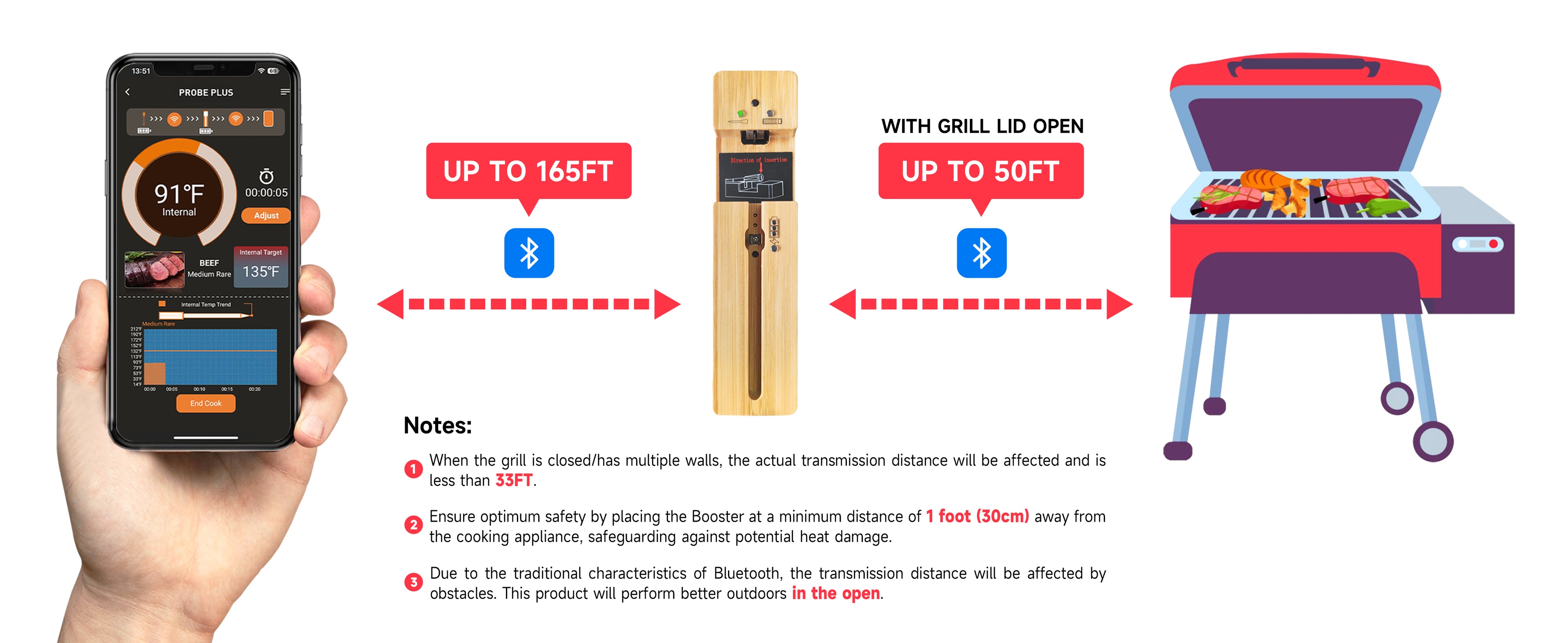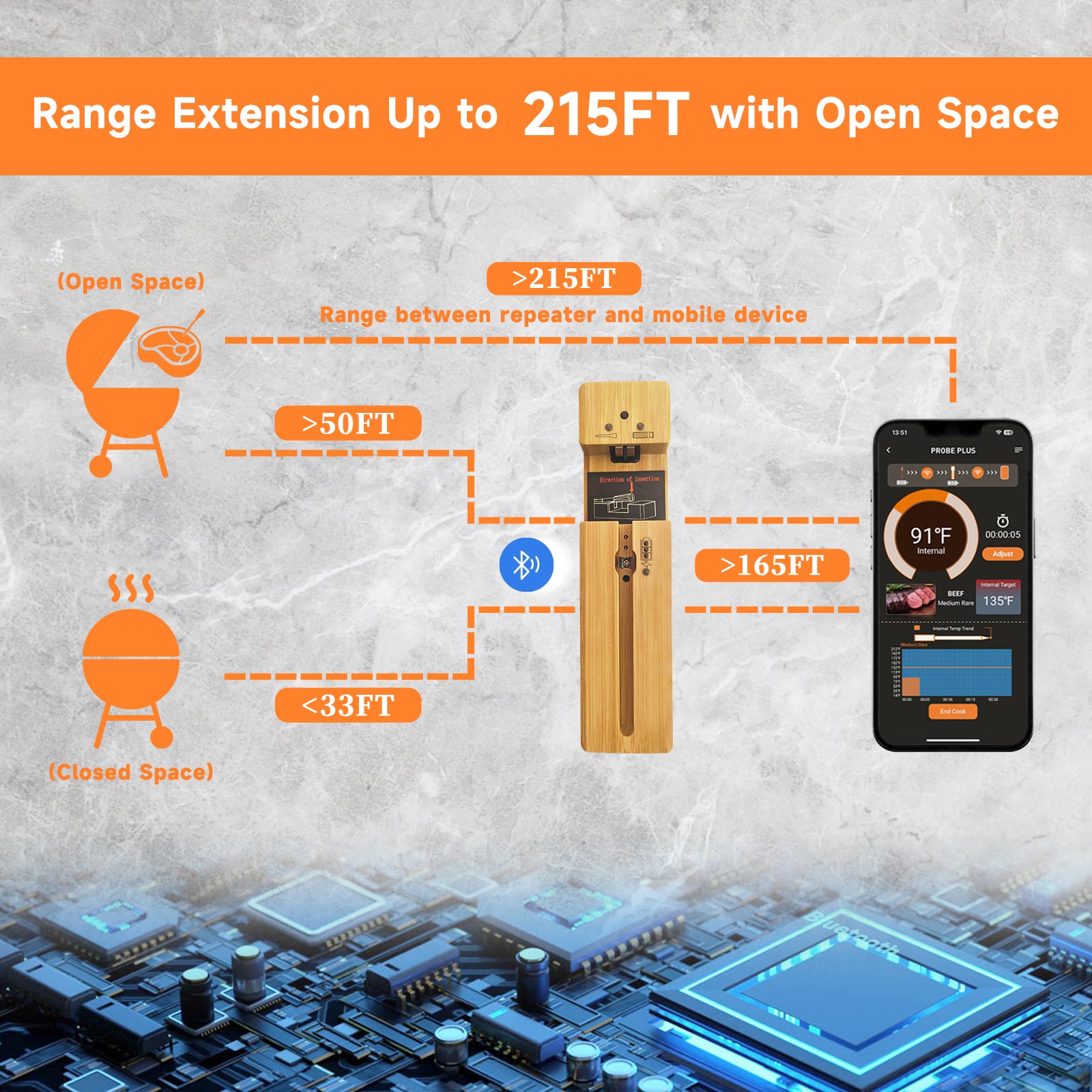 - 215 FT Long Range Mode: Features Bluetooth 4.2 with a range over 215ft (65m) in the open field. Actual transmission distance is affected by walls and obstacles, average range is 30 feet (10m) . Monitor your cook using the FREE app available for iOS / Android smartphones.