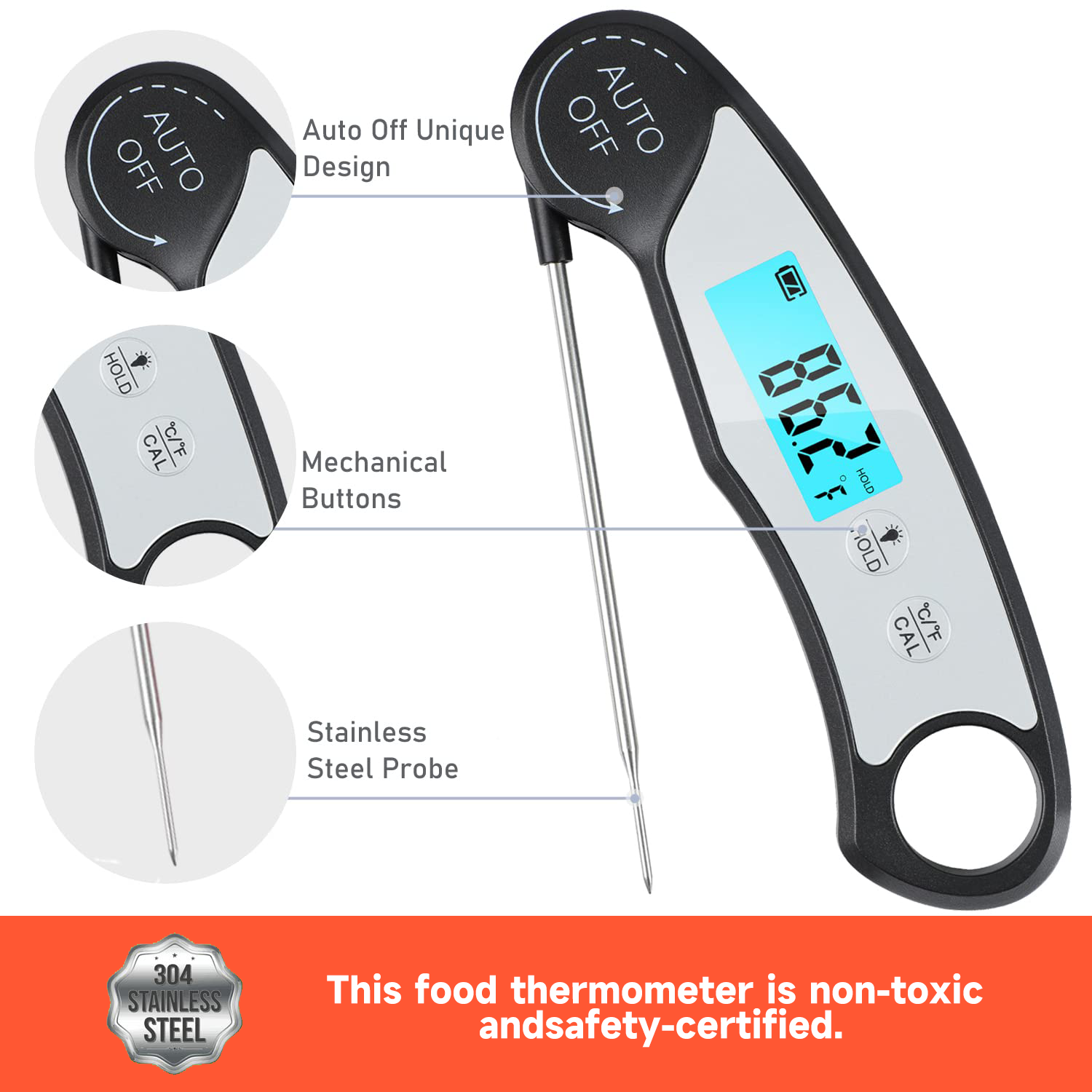 - MULTI-FUNCTIONAL:A large backlight screen can let you see the temperature clearly even if in a poorly lit kitchen or outdoors in too much light. Early warning reminding you to replace the battery in time.Automatic shutdown function activates after 10 minutes without operation. You can lock the temperature with the “Hold” button and see the temperature up close.