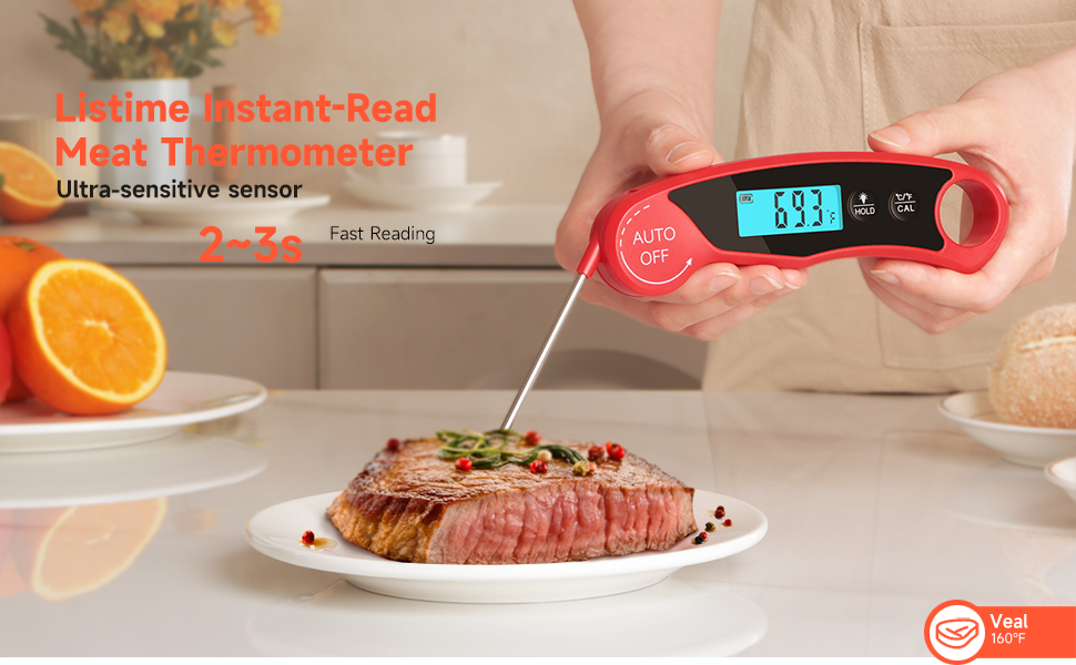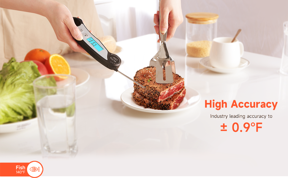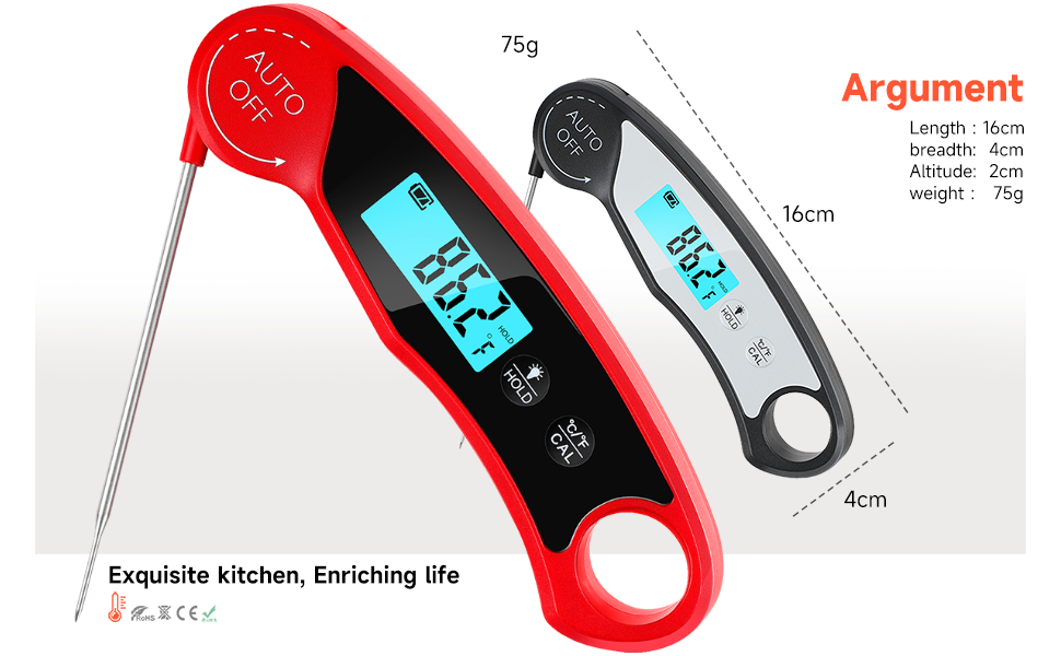 - MULTI-FUNCTIONAL:A large backlight screen can let you see the temperature clearly even if in a poorly lit kitchen or outdoors in too much light. Early warning reminding you to replace the battery in time.Automatic shutdown function activates after 10 minutes without operation. You can lock the temperature with the “Hold” button and see the temperature up close.