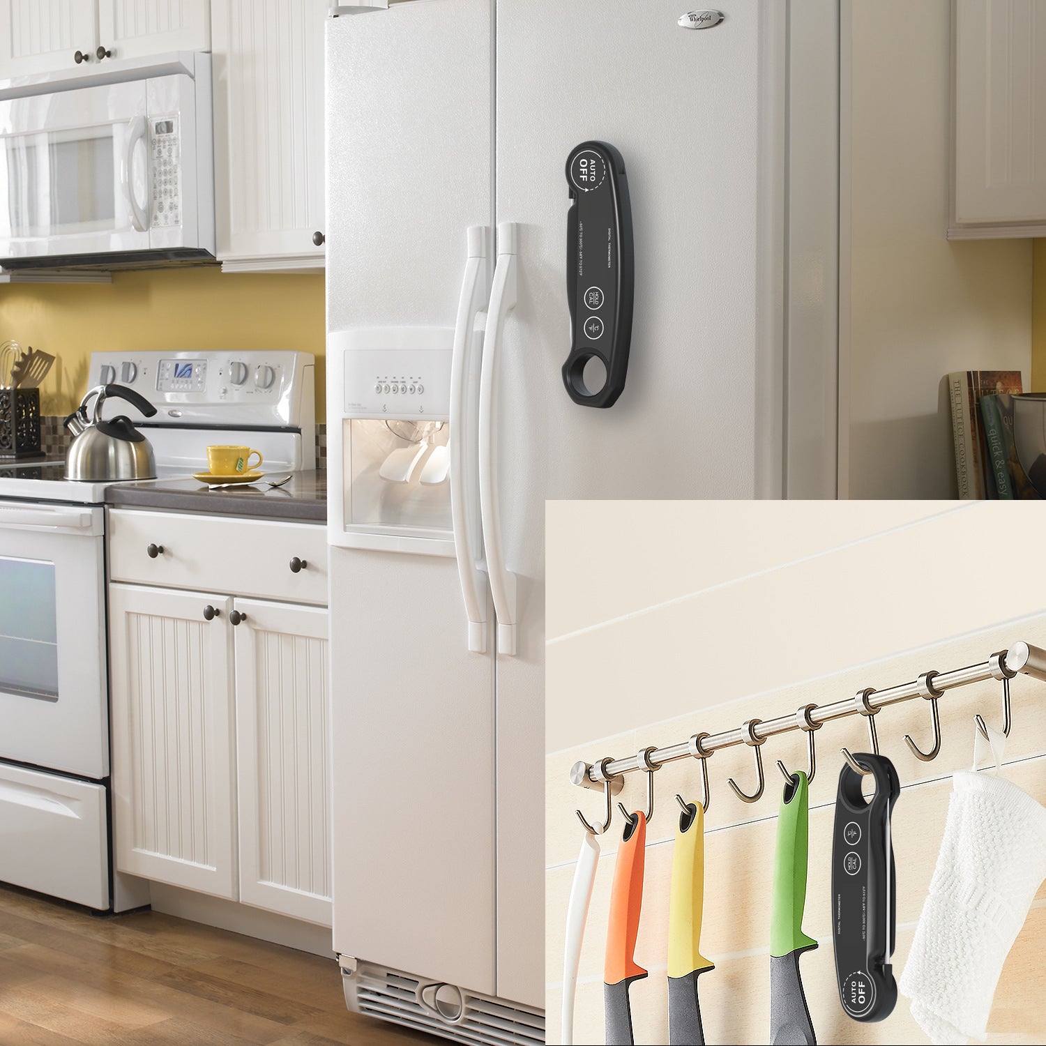The digital food thermometer for cooking has an IP65 waterproof rating, it is not afraid of rinsing under running water, and the quick cleaning saves our cooking time. The powerful magnet function designed on the back can be directly attached to the surface of the refrigerator or other metal tools, or can be placed directly by the ring hook, which does not occupy any extra space and is very convenient for storage.